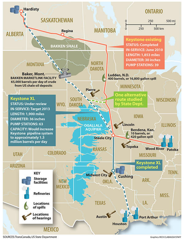 The President visited Cushing to stand with executives from TransCanada and throw his support behind a plan to build the southern half of the controversial Keystone XL pipeline to move tar sands bitumen and crude oil from Cushing to the Gulf Coast refineries in Texas.