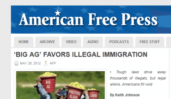 *Mexikaresistance.com Note: American Free Press is also closely allied with conspiracy-nut and Mexican hating racist Alex Jones. Be careful where you get your information from!On May 28, an article titled, “Big Ag’ Favors Illegal Immigration,” appeared on the website of the newspaper American Free Press (AFP). The article relies heavily on an interview with Jon Feere of the anti-immigrant group Center for Immigration Studies.