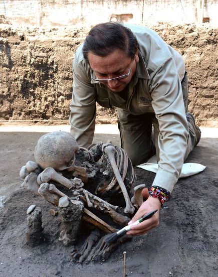 *Mexikaresistance.com Note: It's amusing how "sacrifice" is splashed across the headline of this article, yet the article itself tells a different story. They say that illness was a likely factor, and that some (some, not all) of the bodies had a hole in their head. Why the automatic assumption that this was some sort of "human sacrifice?" Is it possible that these children were dying of an illness and the Tepanekah attempted some form of trepanation to alleviate the sickness?Physical anthropologist Jorge Arturo Talavera González examines 1 of 17 skeletons—including 11 child burials—unearthed recently in Mexico City. The remains, he said, offer evidence of a merchant neighborhood of an Aztec people known as the Tepanec, whose glory days were some 700 years ago.