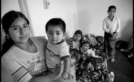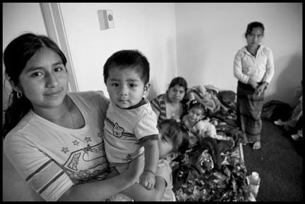 Sabina Cayetano and her son Aron live with other members of her family in one room in an apartment in Santa Maria. Many Mixtec families live here, and in the spring and summer they work picking strawberries.