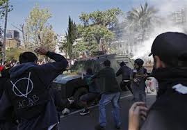 Military police Gen. Rodolfo Pacheco blamed anarchist groups for infiltrating Monday’s demonstration and vandalizing several bank branches. Marches in Chile demanding improvements in education and land reforms are common and generally peaceful, but often end with clashes between police and a minority of hooded anarchist activists armed with rocks and molotov cocktails.