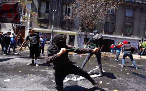 Demonstrators in Santiago threw rocks and other objects at police who responded with water cannons. At least 10 protesters were detained by police, local media reported.