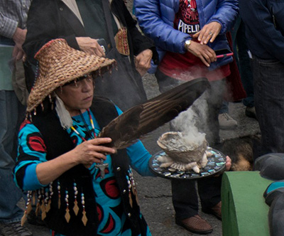Smoke from burning buffalo sage and red cedar circles over a recently carved totem pole. Indigenous tradition says wherever there is sage, evil spirits cannot enter. An elder from the Lummi Nation — a coastal Salish fishing people who’ve lived for millennia on Washington State’s Northwest coast — drums and chants. He urges the crowd gathered at a Seattle church to touch the totem pole and offer blessings for its cross-country journey. Hands reach out to touch an image of a nine-foot bear. At its side are images of salmon and salmon eggs, painted in blue and red ocher. Bears are a part of Lummi mythology, says master carver Jewell James. If rivers and lands are polluted, salmon won’t spawn. Bears won’t eat. At the top of the totem pole is a bowl representing the full moon. Seated next to it is a tribal member performing a fire ceremony, which in Native tradition offers an opportunity to release energy or emotions from the past.