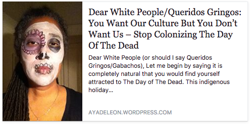 A recent blog post by Aya de Leon regarding Dia de Muertos and colonization has been making its rounds on social media. In it, she lambasts white people for “colonizing” the Mexican tradition. This is not a new argument, and it gets restated every year around this time.
