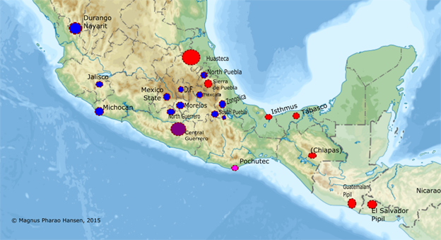 Mapa de distribución de las variantes occidentales (azul) y orientales (rojo). Guerrero central parece haberse separado tempranamente, y el pochuteco está extinto.