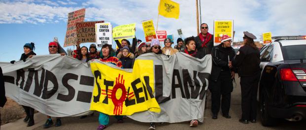 Santa Fe, N.M. — Over 200 clean air and water advocates rallied in front of the Bureau of Land Management (BLM) state office in Santa Fe today to protest the December 5th and 6th online auction of over 89,000 acres of public and ancestral tribal lands, including over 44,000 acres in the Greater Chaco region, and over 40,000 near Carlsbad Caverns National Park. Tribal leaders, environmental groups, and advocates expressed growing outrage at BLM’s chronic disengagement with the public, its lack of meaningful tribal consultation, and its failure to consider the public health and environmental impacts of selling off federal and tribal lands for fracking.