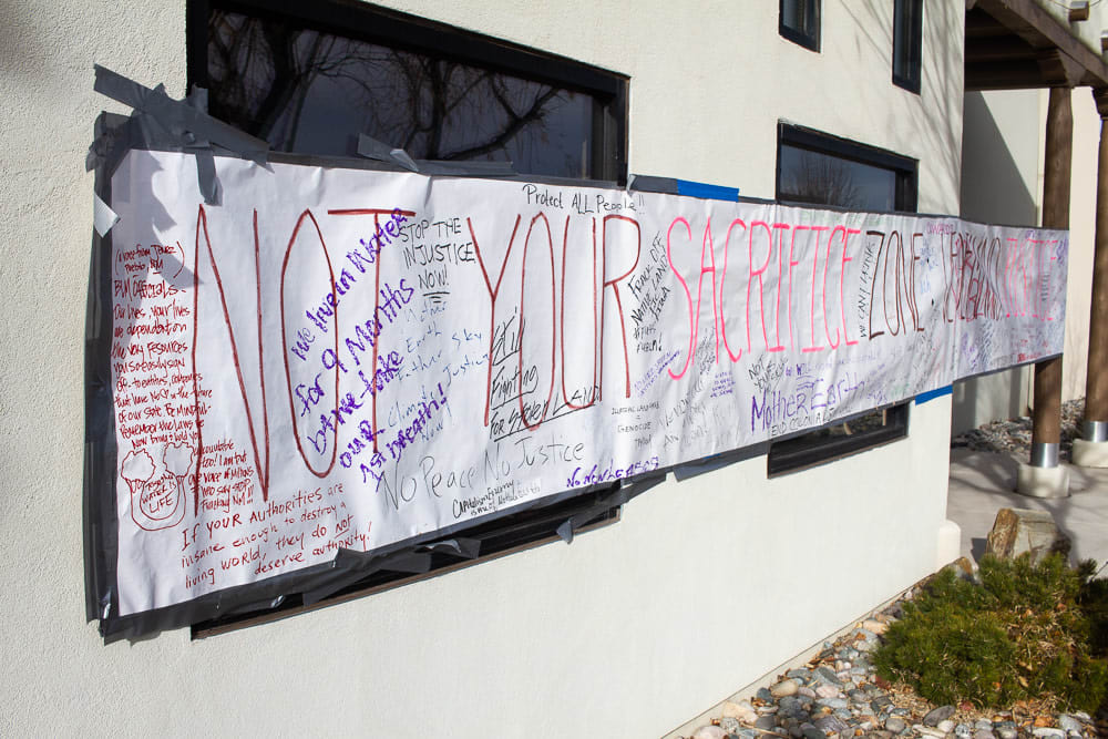 Advocates wrote personalized messages to the BLM on a large banner that read “Not Your Sacrifice Zone: We Demand Justice”, and taped the banner to the front wall of BLM headquarters. “Sacrifice Zone” is a label that has stuck to the Four Corners region since the early 1970s, when the Nixon Administration began prioritizing energy extraction policies, at great cost to the communities, land, and water in the Southwest. With their banner, advocates refused for New Mexico to remain a national energy sacrifice zone, and demanded instead that the BLM engage in meaningful tribal and public consultation, and ensure protections for the environment and public health.